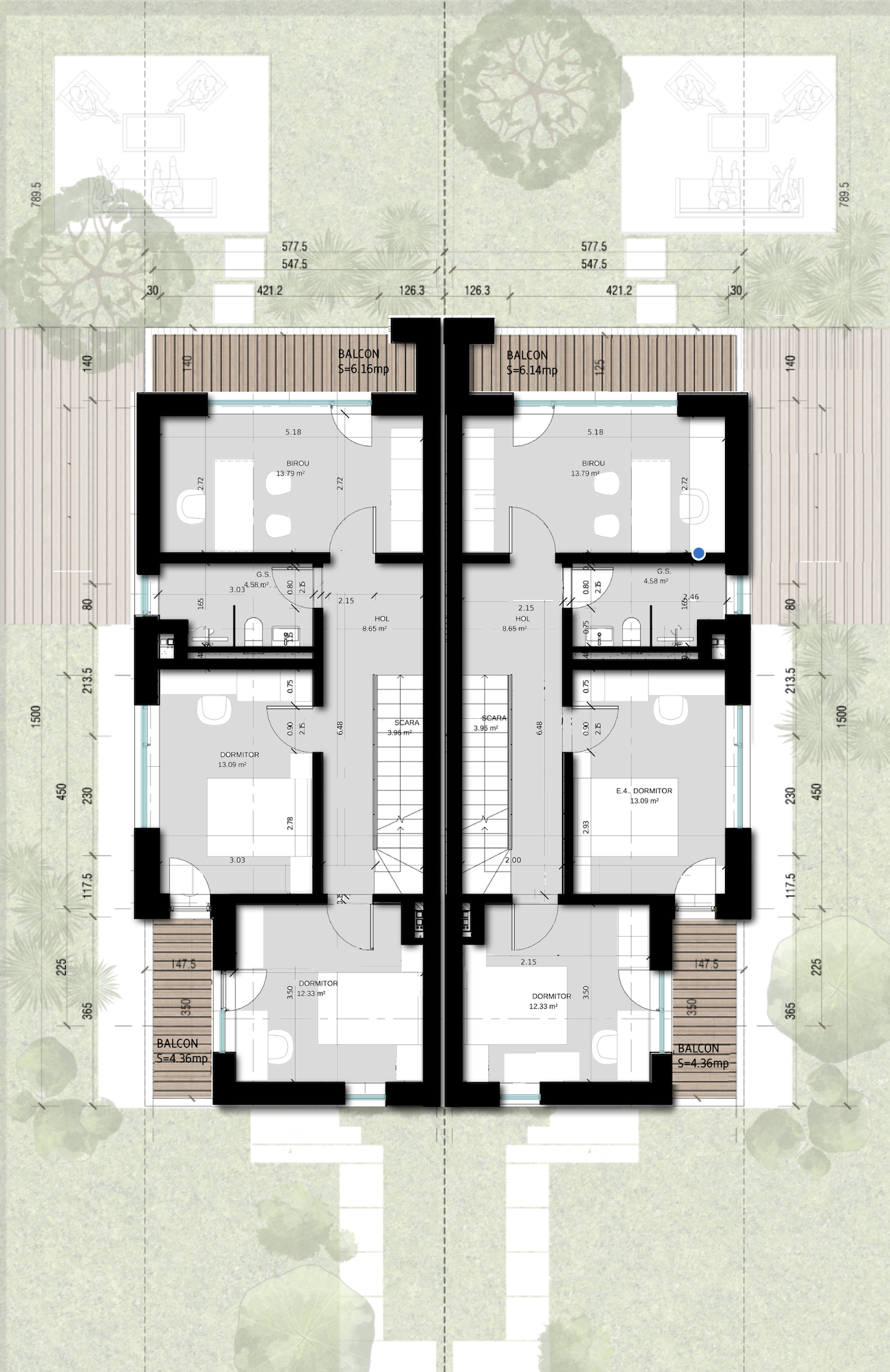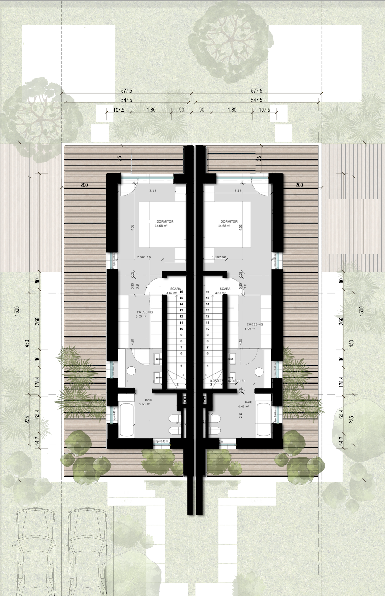 Proiectul include două vile individuale, cu regim de înălțime Subsol + Parter + Etaj 1 + Etaj 2 retras, fiecare beneficiind de două locuri de parcare în curte și curte proprie, spațiu verde. Locuințele dispun de o suprafață utilă de 160 mp, completată de 42 mp de terase – 202mp utili total, și o curte liberă de construcție de 175 mp, oferind un echilibru ideal între spațiul interior generos și confortul exterior privat.